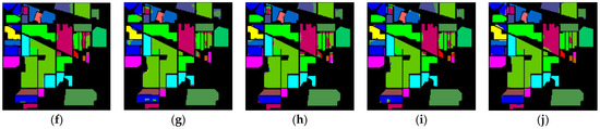 Classification maps of different methods for the IP: (a) ground-truth; (b) 1D-CNN; (c) 2D-CNN; (d) 3D-CNN; (e) 3D-CAE; (f) DBDA; (g) DBMA; (h) DSGSF; (i) AMGCFN; (j) L3DDAN.