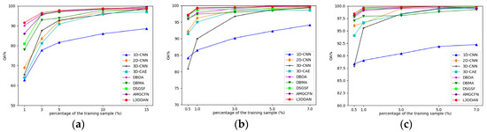 The impact of training samples proportions on classification accuracy for all datasets: (a) IP; (b) UP; (c) SV.