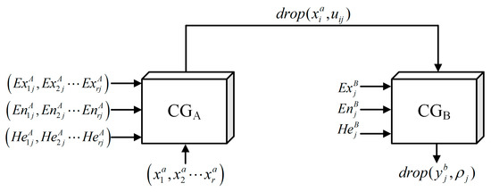 A schematic diagram of the antecedent and consequent cloud generators is shown in Figure 1. When quantification xi in theoretical domain U is given, certainty degree u(xi) for quantification xi over qualitative concept C is generated by the forward cloud generator, which is called the antecedent cloud generator (X-condition generator). The generator takes values with a certain randomness, since u(xi) is generated randomly under the law of conforming to normal distribution. The consequent cloud generator (Y-conditional generator) refers to the process of calculating the quantitative value x(ui) that satisfies certainty degree ui on the qualitative concept by the forward cloud generator for certainty degree . Similarly, each realization of quantitative value x(ui) has uncertainty.