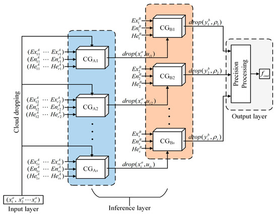 The MFUCI is constructed in the form shown in Figure 3. According to the implementation principle of the cloud model uncertainty inference method, the MFUCI can be divided into four parts: an input layer, cloud dropping, an inference layer, and an output layer. The meaning of each component is as follows:
