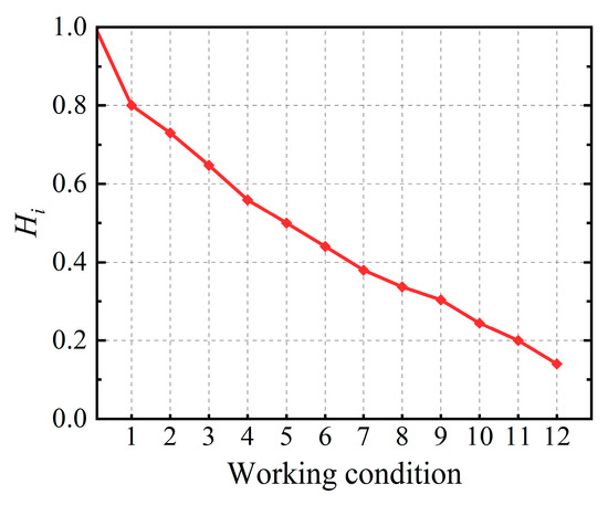 where hi denotes the actual performance level of the structure corresponding to a particular state, h0 denotes the established performance level of the structure in its initial state, and Hi denotes the health degree of the structure in a particular state. According to the definition, Hi can range from 0 to 1. When Hi = 1, the structure is in an intact state.
