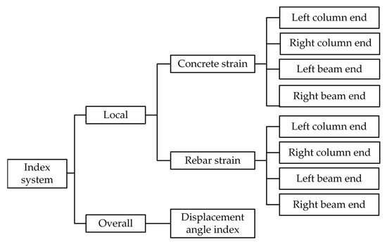 In this study, both local and global performance perspectives are considered, starting from intuitive monitoring indicators. Specifically, the strains of steel rebar and concrete are selected as the local response index for components, while the inter-story drift angle at vertices is chosen as the index affecting the overall behavior of the structure. The mapping mechanism between the state index and the health degree is established using MFUCI, enabling quantification of the safety level of a particular damage state of the structure. For the local damage index, a single measurement point only reflects the localized damage degree of the structure. It is necessary to combine multi-source damage indexes and multiple monitoring measurement points to establish a comprehensive evaluation index system. The specific layout of the measurement points and the index system are shown in Figure 7.