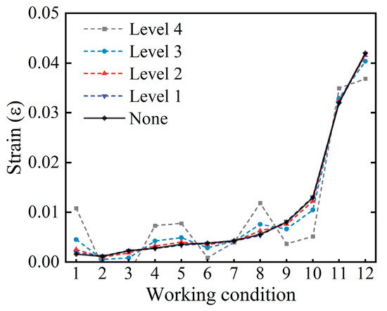 where Ks,i denotes the secant stiffness under the i-th cyclic loading, Ks,0 denotes the linear stiffness in the intact condition of the structure, and and denote the positive and negative peak loads in the i-th cyclic loading, respectively. Based on Equations (24) and (25), Table 2 reflects the details of the health quantification of the four characteristic points of the skeleton curve in the FE simulation. Meanwhile, each working condition is established by selecting the interval process values of five safety levels corresponding to the four characteristic points during the FE simulation. This results in the stiffness-based structural health degradation curve shown in Figure 6.