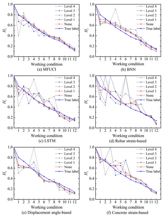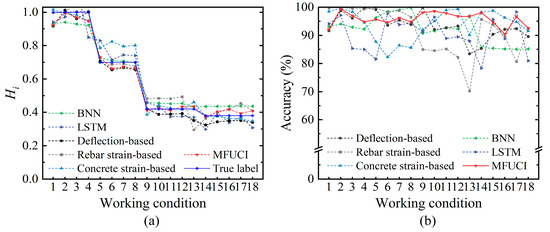 In the previous section, the experimental data for component SJ-T-2 are considered as the architecture sets to build an MFUCI-based qualitative rule base. Considering the effects of monitoring noise as well as the non-uniformity of concrete materials, the experimental data of SJ-T-1 are fed into MFUCI as cross-domain inference samples to demonstrate the robustness and accuracy of the proposed method. Table 10 shows the performance metrics of the proposed study in comparison with baseline models. It is observed that the proposed approach demonstrates superior performance in component health degree mapping compared to the baseline models, with lower RMSE, MAPE, and improved R2 score. Concretely, Figure 17 is a comparative illustration of the sampled health degradation curves and mapping accuracy for the MFUCI and baseline models. It is observed that the maximum error of health prediction obtained when considering the deflection index as an input parameter is 16.57%. The deflection index of component SJ-T-1 in the intact and early stages of damage can better reflect the health level. With increasing damage and late measurement errors, the health prediction is significantly biased. The health predictions obtained with the tensile rebar strain index as an input parameter have greater fluctuation, with a maximum error of 29.79%. However, the inference accuracy exceeds 99% in the uncracked and early damage development of the components. Compared to the deflection and rebar strain indexes, the maximum error in the prediction of health based on the concrete strain damage index is 17.71%, but there is still instability due to errors in a single index. In contrast, MFUCI, which considers the fusion of multiple sources of damage metrics, has a high mapping capability for the inference samples of component SJ-T-1, with an accuracy consistently above 90%. On the other hand, the BNN model exhibits a prediction accuracy second only to the proposed method facing cross-domain inference forms, due to its uncertainty estimation capability. However, the LSTM only performs deterministic point estimation on the training data and shows a lack of ability to generalize cross-domain data with uncertainty. Moreover, the proposed method does not involve a gradient computation and back propagation process, as in BNN and LSTM, and only utilizes the architectural sets to build the architecture of the model, thus demonstrating a better safety evaluation capability in the context of scarce and limited damaged samples. Synthetically, MFUCI provides a better reflection of the current health status at the component level.