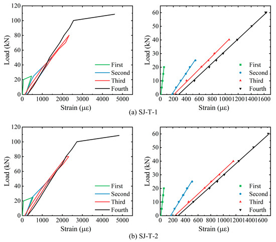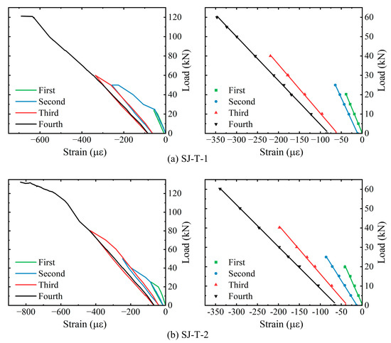 Analysis of load–strain curves for concrete in the pure bending section of SJ-T-1 and SJ-T-2.