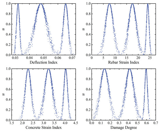 By comparing the experimental results of SJ-T-1 and SJ-T-2, it can be observed that certain deviations exist but with the same trend between the outcomes of the two specimens due to uncertainties such as the non-uniformity of the material, monitoring errors, and initial defects in the model. These uncertainties manifest as fuzziness and uncertainty in the condition indexes and damage extent. In this regard, the advantages of the robustness of the proposed method in the face of uncertain data are demonstrated using a form of cross-domain inference. Specifically, the samples of component SJ-T-2 are considered architecture sets to build a cloud inference qualitative rule base, while the samples of component SJ-T-1 are considered inference sets for health degree mapping inference. According to the force characteristics of reinforced concrete, the mid-span deflection, the strain of rebars in the tensile zone at the bottom purely bending section of the beam, and the strain of concrete in the compressive zone at the top are selected as the three condition input parameters for MFUCI. According to our analysis in the previous section, spanwise deflection, tensile rebar strain, and compressive concrete strain within the purely bending section of the component are found to exhibit different rates of linear growth under different loading stages. Consequently, the magnitude of the rate of change of each damage index is used as an input parameter for MFUCI in this paper. To eliminate the effect of static load, the rate of change of each index under load is defined to achieve MFUCI universality: