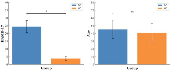 All DD patients, excluding those with depressive episodes due to bipolar disorder, were collected from the designated hospital for psychosis, and the HCs were selected from the local community after a professional screening. We randomly recruited 41 patients with DD (10 males and 31 females, respectively). This is consistent with the existing reports that the prevalence of depression is higher in females than in males. Meanwhile, in order to retain this original imbalance the in control group, we randomly selected 34 HCs (11 males and 23 females, respectively). All participants completed the Hamilton Depression scale (HAMD) before EEG data collection. All the HCs had a HAMD score of less than 7, while DD patients had a HAMD score of more than 17. All included subjects were right-handed and prohibited from drinking alcohol and taking psychotropic drugs for 8 h before EEG recording. The age of patients with DD ranged from 19 to 61 years old, with an average age of 45.22 ± 11.80 years old. The age of the HCs ranged from 21 to 57 years, with a mean age of 40.18 ± 11.67 years. There was no significant difference in age between the DD group and the HC group, and there was a significant difference in HAMD-17 scores, as shown in Figure 1 for basic information. The experiment was approved by the Ethics Committee of Zhejiang Normal University, and all participants signed a written informed consent form before the experiment.