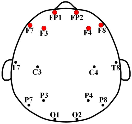 Sixteen EEG channels’ names and locations; red dots indicate the frontal six channels selected for this study.