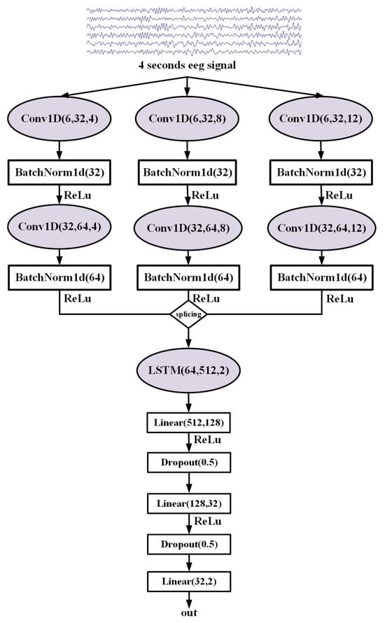 The MRCNN-LSTM model structure is shown in Figure 3, and it mainly includes two parts: MRCNN and LSTM. The first part of MRCNN uses three branches with different convolution kernel sizes in parallel to extract EEG features with the CNN model. Each branch uses a convolution kernel with different sizes to extract features with different scales, and uses the ReLU activation function for nonlinear transformation to enhance feature expressiveness. In the second part of LSTM, the features are spliced and input into an LSTM layer to extract the timing information from the EEG features. The LSTM layer remembers the previous state through a long short-term memory unit with a gating mechanism and updates the state according to the new information input to capture the temporal dependence of the data. The output of the LSTM layer is fed into a fully connected layer and a Dropout layer to improve the generalization ability of the model and suppress overfitting. Finally, binary classification is implemented by a softmax classifier to predict the labels of the inputs.