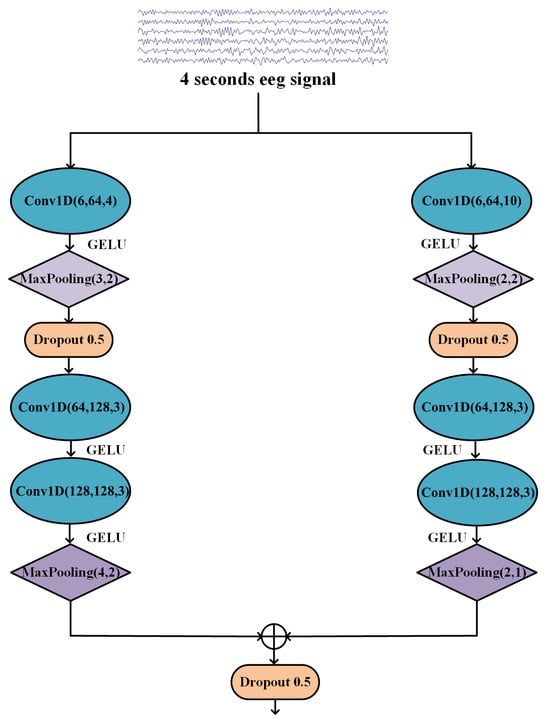 In accordance with the existing research results, a CNN model with multi-resolution convolution kernels (MRCNN) is proposed in this study. As shown in Figure 4, the MRCNN model contains two branches with two different convolution kernels. Three convolutional layers and two maximum pooling layers are used in each branch. The convolution kernels used in the first branch are set as 4, 3, and 3, respectively. The convolution kernels of the second branch are set as 10, 3, and 3, respectively. In addition, each convolutional layer includes a normalization layer for normalizing the input data, and a Gaussian error linear unit (GELU) is used as the activation function; it is smoother than the traditional ReLU activation function and can better deal with nonlinear features.