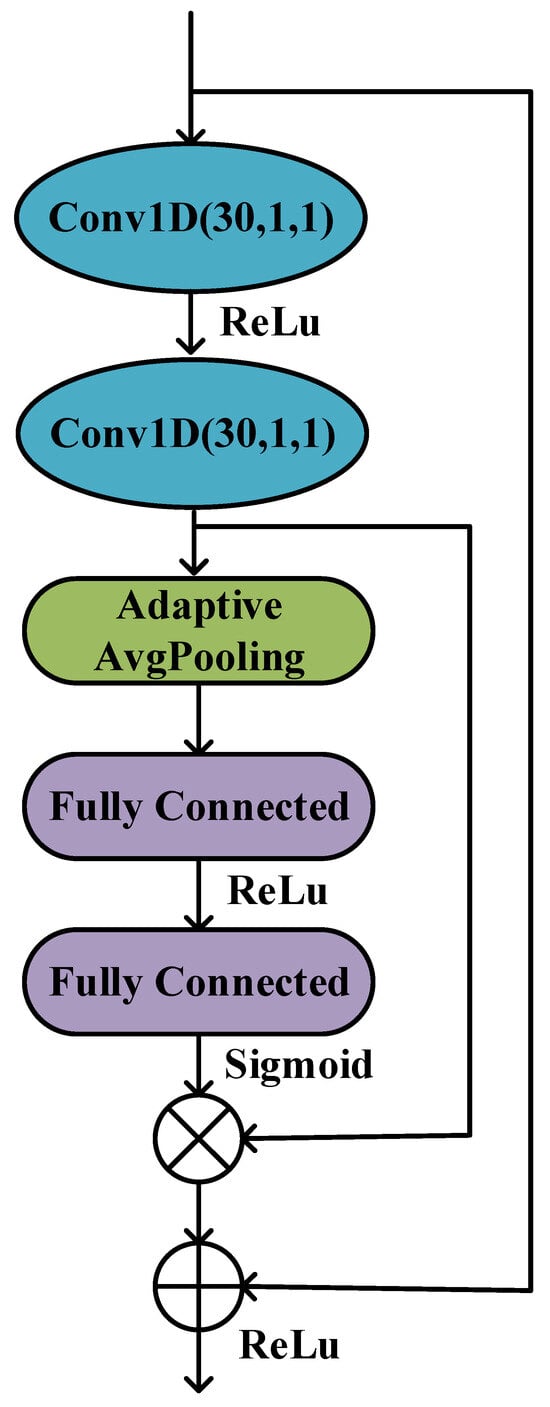 To improve the learning performance of the MRCNN model, a calibration module was designed for the features extracted by the convolutional layer to model the interdependence between the features. The residual squeeze-and-excitation (RSE) block was used in the MRCNN model, which is named MRCNN-RSE for short, to adaptively select the most discriminative features. Specifically, the RSE block adaptively selects and readjusts features, helping the model to better utilize contextual information in its local sensory field. In the calibration module, two convolutional layers with a kernel and step size of 1 are used to further extract features, the adaptive pooling layer is used to compress the features, and then two fully connected layers are used to aggregate the information. The first layer uses the ReLU activation function to reduce the dimension, and the second layer uses the sigmoid activation function to increase the dimension. The specific structure for the RSE block is shown in Figure 5.