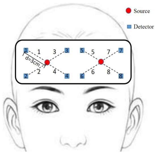 In near-infrared spectroscopy detection, it is found that the selection of the light source-detector distance (d) has a great influence on the detection depth. If the interval is 1 cm, the measurement of the superficial cortex can be realized, but there is more noise interference. With the increase in d, the imaging depth of the banana-shaped path will become deeper [22]. When the distance exceeds 5 cm, the signal will become very weak and mixed with unusable signals [23]. When the distance (d) of the organ is 3 cm, the hemodynamic response signal of the PFC has the best measurement effect. Figure 2 shows the distribution layout of multiple light sources and detectors used in our emotion state classification experiments. In this experiment, we place the center position of the bottom two detector distances at the FPz position of the international 10–20 system to eliminate the positional uncertainty between participants [24,25].