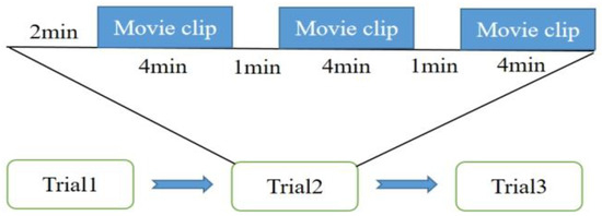 First, the participants were asked to sit in a comfortable chair. Before the experiment started, we asked the participants to relax for 5 min to eliminate the hemodynamic reactions left over from previous activities, and informed the participants to remain relaxed and avoid unnecessary movement or thinking during the experiment. The researcher explained the experimental procedures to the participants and ensured that the participants completed the tasks correctly. Participants sit in comfortable chairs in front of a computer screen that displays experimental tasks. Each experiment requires 3 trials, as shown in Figure 3. After each data recording session starts, there is a pre-experiment rest time of about 2 min to obtain the baseline level of blood oxygen information, then three movie clips (happy, neutral, and sad) that cause different emotional changes are played, and we ensured that the movie clips played in each experiment are not repeated. Each movie clip is 4 min. After each movie clip is played, the participants have a 1 min rest period. The trial lasts for 16 min (960 s) for a total of 48 min.