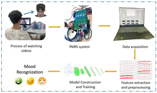 In recent years, research on the theme of affective computing has become more and more active, and emotion recognition has become more and more popular in the field of great health industry and artificial intelligence [1]. The purpose of emotion recognition is to detect the emotional state of people in a specific scenario under the conditions of relevant data records. Previous research on cognitive psychology has shown that the emotional information of human emotional states is intrinsically linked to the activity of the cerebral cortex, and emotional changes can directly cause the response of the electroencephalogram (EEG) [2]. However, there are certain shortcomings in the recording of EEG signals, which are greatly affected by eye movement interference, so they still have certain difficulties in emotion recognition [3]. With the development of portable multi-channel near-infrared spectrometers, near-infrared spectrometers are considered as cost-effective and light-weight measurement systems with better spatial resolution than electroencephalograph (EEG) devices, and they are favored by more and more practitioners [4,5]. Because fNIRS data generated in response to emotional stimuli are unique, individuals cannot mask their emotions even if they want to [6]. This key advantage of fNIRS devices has been underutilized in the existing literature in the fNIRS field. Due to the poor generalization of features among participants, emotion recognition has become a difficult problem for researchers for a long time [7,8]. Our work focuses on monitoring changes in blood oxygen concentration in the prefrontal cortex (PFC) of the brain using a near-infrared spectroscopy (fNIRS) system, and mainly records the trend of oxygenated hemoglobin (HbO2) and deoxygenated hemoglobin (Hb) over time. Then, we use the deep learning algorithm to identify the human emotional state and obtain the inner connection between human emotional information and cerebral cortex activity.