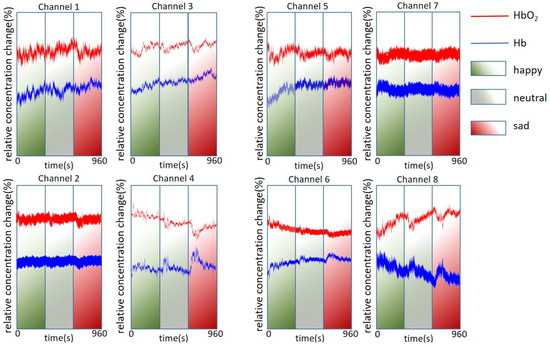 The data we obtained are the original data of a single trial process, and the relative concentration change data are obtained after the Modified Lambert–Beer Law (MBLL) is applied. As shown in Figure 5, for each channel, we averaged the relative concentration changes of HbO2 (red line) and Hb (blue line) for all participants under different emotional segments and displayed the waveforms (there is no filtering here). In each channel, the horizontal axis represents the range of time, the specific process corresponds to a single experimental segment in the experimental process in the previous section, and the vertical axis represents the relative concentration change of the absorbing group. In this step, the fNIRS data of eight channels show the different activation states of different regions of the PFC of the brain, and the region selection refers to the Brodmann area [29]. Among them, the relative concentrations of chromophores in channels 1, 3, 4, 5, 6, and 8 change significantly. Taking channel 8 with the most obvious trend, the concentration of HbO2 increases (accompanied by the decrease in Hb concentration) during the process of watching joyful movie clips, which shows that the comedy segment caused the activation of the frontopolar prefrontal right region [30], followed by a 1 min rest segment, showing a downward trend in HbO2 concentration. Then, there is the process of watching a neutral movie clip. In this process, the data of the eight channels can be integrated, and it can be seen that the trend fluctuation is relatively smooth compared with the other two clips. After that, there is another 1 min rest process with the relative concentration trend decreasing. Then, there is the process of watching sad movie clips. Compared with watching joyful movies, the relative concentration of HbO2 also has different degrees of change. In summary, it can be concluded that watching movies that represent different emotional types can cause different activation responses in multiple regions of the PFC of the brain, and the PFC area is involved in a variety of complex emotions as well as cognitive activities.