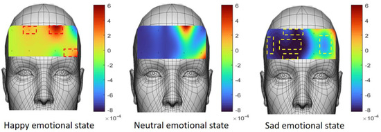 Figure 6 shows the average response degree of ΔHbO2 of selected participants under three different emotional segments. In the joyful emotional segment, the changes were most pronounced in the left and right dorsolateral prefrontal cortex (from the perspective of the participant) and orbitofrontal cortex (left) (red dashed box), which were strongly activated. It has been shown that the generation of positive emotion is accompanied by a lower HbO2 concentration change response in the right side of the PFC [32]. For neutral emotional clips, the brain activity is relatively stable, and the concentration of oxyhemoglobin and deoxygenated hemoglobin may remain at a relatively stable level. However, in view of the fact that the experimental process involves watching a neutral video after a 1 min break after watching a high-activation-state joy video, there may be a continued decline in the HbO2 concentration during the process, and the blue area of the frontopolar prefrontal cortex appears. During the processing of sad emotions, brain activity is reduced, leading to a decrease in HbO2 concentration, which is particularly evident in the polar prefrontal cortex (left and right), orbitofrontal prefrontal cortex (right), dorsolateral prefrontal cortex (right), and ventrolateral prefrontal cortex (right) (yellow dashed box). Some recent studies have also found that different emotions are related to different brain regions, which supports the rationality of corresponding and differentiating various emotions and hemodynamic responses. It should be noted that the relationship between emotions and parameters such as blood oxygen concentration is complex and affected by multiple factors such as individual differences and environmental factors. Therefore, in order to express the emotional state more accurately, multiple physiological and psychological indicators need to be considered comprehensively.