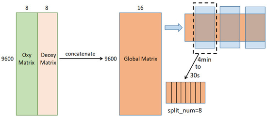 According to the previously described fNIRS data-processing habits, this paper divides the ΔHbO2 and ΔHb relative concentration change data of eight channels into two matrices and connects them horizontally (as shown in Figure 7), and uses a large matrix of 9600 × 16 to represent the fNIRS data of each experiment for subsequent training. In order to improve the convergence speed of the network and the accuracy of emotion recognition, we set a split_num in the process of writing the code, which means that the 4 min segments corresponding to each emotion category are divided equally. We set the split_num to 1, 2, 4, and 8 for data segmentation (Figure 7 shows the segmentation diagram when split_num = 8), 1 means to follow the original length, and 2 means to divide the time length of each original emotional segment equally to obtain twice the sample size, and so on. Afterwards, we conducted training separately and found that the highest accuracy was obtained when split_num = 8. This may be due to the fact that if split_num takes a small value, the time spent watching the same emotional clip is too long, and it is difficult to maintain the participant’s responsiveness to the stimulus at the highest response state all the time, and the information about the fNIRS data corresponding to other labels will be obtained. Moreover, a single time window will be too long and the number of samples will be small, which makes the training process difficult. Each movie clip is 4 min in duration; if we set split_num = 8, we will obtain a time window sample of 30 s. This duration is relatively long in the field where fNIRS data can be used for training, and this can provide complete emotional information. But if the number of splits is larger, emotional information may be lost, so we set split_num = 8 to prepare for subsequent training and confirmed that this is the best choice for this data segmentation. Figure 7 is a schematic diagram of data segmentation.