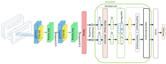 where , , , are the weight and bias matrices for linear transformation; is the modified linear unit activation function. The subsequent Add&Normalize layer adds the input data and the calculated features, allowing the model to learn the residual representation, which can alleviate the problem of gradient disappearance and speed up the training process of the model. Finally, the attention is turned to the high-dimensional space through the Linear layer and the result is output through the Softmax layer.