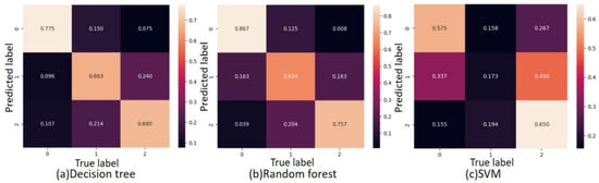 Overall, we noticed that machine learning and deep learning algorithms have the highest ability to identify joy emotions, which is because the HbO2 parameters are fully activated when watching comedy, and this activation feature is fully utilized. The recognition accuracy of neutral emotions (label 1) is the lowest, because some data have different degrees of fluctuations, which may be predicted as label 0 or label 2, while the probability of sad emotions being recognized is in the middle. Regarding this problem, it may be that the participants’ reaction to the previous video has not completely disappeared while watching the neutral emotion video, and we should select more neutral emotion clips to collect better neutral emotion data. We have tried to adjust the parameters many times and sorted out the results of each classifier for recording. In order to understand the performance of each classifier more clearly and facilitate comparison, as shown in Figure 10, we give the classification accuracy map of each classifier for ternary emotion recognition.