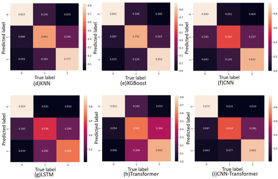 We trained the model based on tensorflow2.12.0 on GPU Nvidia RTX3070. fNIRS data are typical time series data, which corresponds to the TSC method in the field of machine learning [34]. Based on the cross-entropy loss, we trained each TSC method for deep learning for 300 epochs. We first used decision tree, random forest, support vector machine (SVM), K-Nearest Neighbor (KNN), XGBoost, and other machine learning classifiers to train the data. It is worth noting that the best performance is the XGBoost classifier, whose average accuracy can reach 80.5%. Then, we used the convolutional neural network (CNN), Long Short Term Memory network (LSTM), and Transformer network for training. The classification accuracy of the convolutional neural network can reach 82.6%. However, compared with XGBoost, the performance of the convolutional neural network on these self-built datasets is not outstanding. The CNN-Transformer network proposed in this paper produces an average recognition accuracy of 86.7%, which shows a good effect in this research field. Figure 9 shows the result of the confusion matrix of all classifiers (label 0 represents joyful emotions, label 1 represents neutral emotions, and label 2 represents sad emotions).