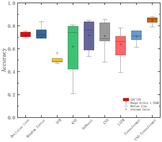 Through the Friedman test analysis results table, it can be seen that the CNN-Transformer algorithm has the highest median, while the SVM algorithm has the lowest median. The significance p value is 0.000 ***, so the statistical results are significant, indicating that there are significant differences between Decision tree, Random forest, SVM, KNN, XGBoost, CNN, LSTM, Transformer, and CNN-Transformer; the difference magnitude Cohen’s f value is 0.718, which means there is a large difference.
