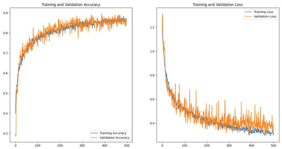 As can be seen from the above figure, XGBoost has an absolute advantage in machine learning algorithms, and the average recognition accuracy of CNN in deep learning algorithms is comparable to it. The CNN-Transformer network proposed in this paper uses convolution operations and attention mechanisms to make it significantly better in the ternary emotion recognition task than other classifiers, and it is stable overall. Figure 11 shows the graph of the training accuracy (accuracy) and loss (loss) during the training process of the CNN-Transformer network. It can be seen that after 500 epochs, the model gradually converges.