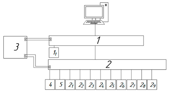 The principle of operation of the device is as follows: When pump 4 is operational, signals from sensors 21, 22, …, 29 are fed to relay 2, which collects information from all the control devices. Experimental data is then transmitted from relay 2 to controller 1 via the Modbus protocol. The data are recorded in registers and sent to a PC via the RS-232 interface. On the PC, in the automated control system (SCADA-system), the current values from the control devices are displayed and recorded in the database. Measurement data of sensors 21, 22, …, 29 are stored on an external storage device (e.g., an SD card) using module 11. Data arrays are recorded in table formats. File format: *.txt, *.csv, *.xls, etc. Communication module 5 transfers information according to the Groupe Special Mobile digital mobile cellular communication standard to external information storage (e.g., cloud databases).