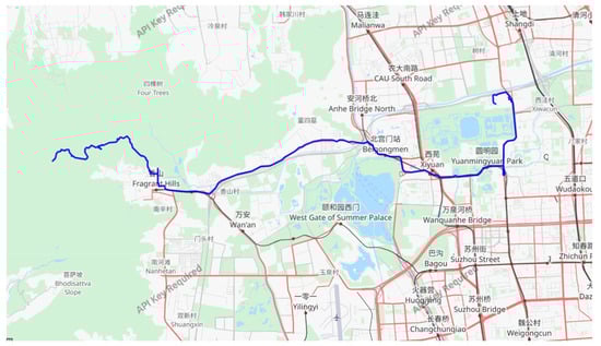 (2) Case 2: For this case, we utilized the Geolife Beijing vehicle GPS trajectory dataset (https://www.gpsvisualizer.com/, accessed on 20 October 2023), which consists of 13,987 GPS coordinates, where the GPS coordinates are composed of longitude and latitude values. Among these, 80% were chosen as the training set for the model, while the remaining 20% were used as the test set. Figure 6 showcases an example trajectory from this dataset.