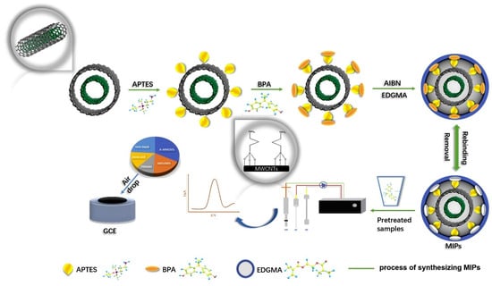 - Chen, Z.; Tang, C.; Zeng, Y.; Liu, H.; Yin, Z.; Li, L. Determination of Bisphenol A Using an Electrochemical Sensor Based on a Molecularly Imprinted Polymer-Modified Multiwalled Carbon Nanotube Paste Electrode. Anal. Lett. 2014, 47, 996–1014. [Google Scholar] [CrossRef]