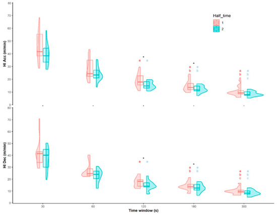 Worst-case scenarios of the elite futsal referees in the different time windows in accelerations and decelerations. * Significant differences between halves. a,b,c Significant differences between time windows [30 (a), 60 (b), 120 (c), 180 (d), 300 (e)].