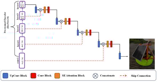 For the rust area segmentation task, the segmentation results can be affected by the effectiveness of the features extracted from the input image. To enhance the extraction capability of the network, a ResNet [24] with the final pooling and fully connected layers removed is adopted. Richer features can be effectively obtained because of the deeper network and less FLOPs. The improved network is based on the U-Net. The encoder–decoder architecture and equal amounts of downsampling and upsampling segmentation network are adopted, shown in Figure 2. The transfer learning methods can be introduced with the help of the proposed framework, which solves the problem of insufficient dataset. To solve the problem of weak computational capability, an SE attention module is introduced to the decoder. The interdependence between channels is set up to guarantee its performance. In Figure 2, S represents the spatial resolution of the input image. For corroded and non-corroded areas, two input feature maps with different resolutions for each layer in the decoder are used. The corroded feature is sampled by the UpConv block. The SE attention block is utilized to reflect the relationship between channels. It is also used for solving the disadvantage of low FLOPs.
