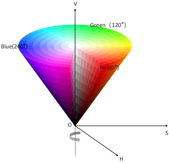 Machine vision-based image processing methods usually convert color images into grayscale images, and screen oxidation layers and contaminated areas by grayscale thresholds [25,26,27]. However, for the rusted surface of metal material, it is difficult to identify the rusted area because the gray value of the rusted area in the grayscale image is very close to the gray value of the metal material substrate and surface oil, etc. Therefore, this paper adopts a color space conversion algorithm to convert RGB images into HSV space, realizes the extraction of rusted areas on steel surfaces by setting extraction thresholds, and calculates the percentage of rusted parts to the total pixel points of the image to determine the degree of rusting. HSV (shown in Figure 3) is a color space model established in a cylindrical coordinate system, as shown below. Where H is hue, S is saturation, and V is luminance, where the value range of hue H is [0°, 360°], and red, green, and blue are 120° away from each other; the value range of saturation S is 0–1, and only grayscale when S is equal to 0; the value range of luminance V is the same as saturation S, which is not directly related to light intensity. The RGB of the color image is exchanged to HSV space by the nonlinear transformation formula.