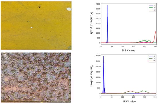 HSV color histograms with and without rust are shown in Figure 7, from which a range of HSV color values can be obtained. It is clear that the HSV curves with and without rust are quite different. It is worth mentioning that the rust may exist in the non-metal parts, which can affect the accuracy of rust extraction and assessment. Therefore, the method of image segmentation is used to extract the metallic parts while filtering out the non-metallic parts to improve the accuracy of rust extraction.