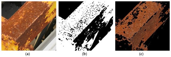 Comparison of extracted rusts based on grayscale threshold and HSV color space conversion. (a) Area to be tested, (b) grayscale threshold image, and (c) HSV color space conversion image.