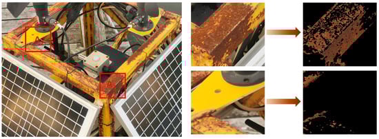 The rust segmentation and extraction method based on improved U-Net and HSV color space is introduced to our work. It has a lower false detection rate compared to the grayscale threshold method.