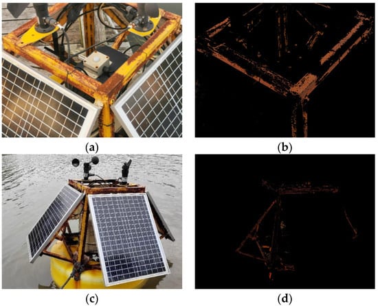 Figure 10 shows the experimental results of rust extraction of buoys; Figure 10a: the image has the influence of light; and Figure 10c: the image has the influence of water surface. Figure 10b,d, respectively, are two graphs of rust extraction results based on the color space conversion method, both can extract the rust area more accurately.
