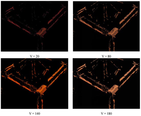 The HSV method can be affected by low light and brightness, but the experimental environment is selected to ensure illumination and avoid impact. The values of H, S, and V may affect the rust extraction. Figure 11 shows the rust extraction at different V value, the processed image comes from Figure 10a, the H and S values remain unchanged at 200 and 10, respectively. It is obvious that the rust extraction effect with V = 20 is significantly inferior to the other three situations. It indicates that under conditions outside the threshold range, the rust extraction effect is poor. Compared with Figure 10a, the rust extraction amount with V = 80 is less than those with V = 140 and V = 180. To further analyze the impact of all the parameters in Table 4 on rust detection, a lot of experiments are carried out, and the results are shown in Table 10. It can be seen from the table that under the condition of fixed V value, within the threshold range given in Table 7, changing the values of S and H has little effect on the extraction results of corroded pixels. But when changing the V value, the extracted corroded pixels change significantly. Hence, brightness has a significant impact on the accuracy of rust detection.