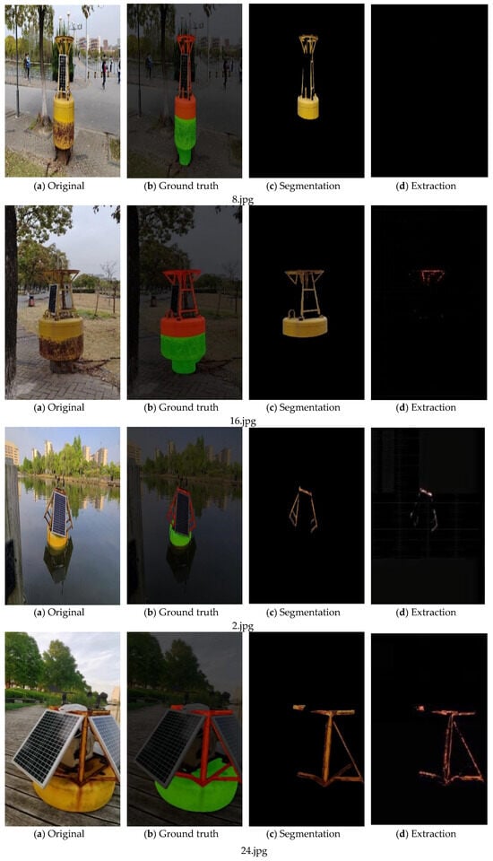 As shown in Figure 12, the processing results of the fusion algorithm are (a) for the whole buoy image without obvious rust, where (a) is under good lighting conditions and (b) is under slightly poor backlight conditions; (c) and (d) for the buoy image with obvious rust, where (c) is under good lighting conditions and (d) is taken with slightly poor backlight intensity. The first image of each group is the image to be processed, and two kinds of buoys are chosen in the experiment: buoys onshore and in water. The second one is the result after segmentation by the improved U-Net model, here the red, green, and black zones are the same as those in Figure 10. The third one is the image of extracted metal part of the buoys; the non-metallic parts are filtered. The fourth one is the extraction of the rusted part. After extraction of metal part by color space conversion method, the rusted part is extracted from the metal part.