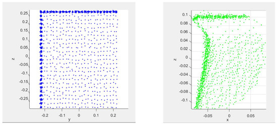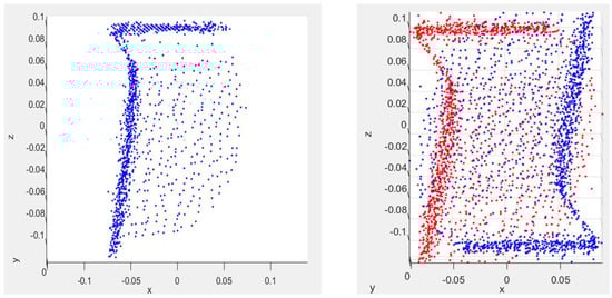Profile view of a point cloud of a cuboid before (left) and after applying the mirroring technique for limiting superquadric overgrowth (right) in meter units. In the right plot, the red data points correspond with the initial point cloud of the cuboid and the blue data points correspond with the additional data points that were generated by applying the mirroring technique.