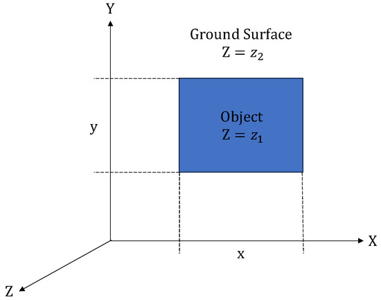 A common approach to reducing the effect of multipath interference is to place the ToF sensor directly above an object that is placed flat on a ground surface in a top-view fronto-parallel configuration [21,22]. In this configuration, only the top surface of an object is visible to the ToF sensor. An example of a cuboid object in such a top-view fronto-parallel configuration is shown in Figure 2. In this configuration, the x- and y-dimensions of the object can be readily determined with respect to the x–y ground plane. The z-dimension can also be readily determined by taking the difference in depth measurements between the top surface of the object and the ground plane surface. In this configuration, since the interface between the object and the ground surface is not visible, the effect of multipath interference between the object and the ground surface is greatly reduced. However, this configuration is only feasible for a limited number of environments and applications.