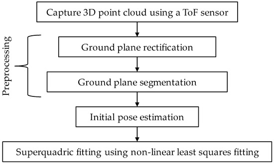 As discussed above, point cloud data that are obtained from a single ToF sensor typically suffers from issues such as low resolution, self-occlusions, noise, and multipath interference. These issues tend to distort the shape and size of objects, which creates challenges for dimensioning objects using a ToF sensor. In this work, we propose an approach that overcomes these challenges by fitting a parametric model to the point cloud data. Given a set of point cloud data points () from a ToF sensor, our proposed approach uses non-linear least squares fitting to determine the parametric model that best fits the point cloud data. Our experiments show that directly applying a parametric fit to the point cloud data without any preprocessing results in large estimation errors. To address this issue, in our proposed framework, we preprocess the point cloud data using the following steps: ground plane rectification, ground plane segmentation, and reorienting the point cloud within a new local coordinate system before performing the initial pose estimation. Using this approach, the subsequent parametric fitting shows significantly lower dimensioning errors. Figure 3 provides an overview of our methodology.