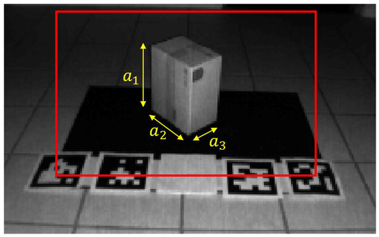 Figure 4 is an example of an intensity image of a scene with fiducial markers and a box positioned on top of a black felt surface. The dimensions of the box are labeled as , , and . In this example, = 149 mm, = 223 mm, and = 286 mm. In our experiments, ArUco fiducial markers are initially used to determine the orientation of the ground plane with respect to the ToF sensor. An ArUco marker is a 2D binary-encoded fiduciary marker that can be used for camera pose estimation [38]. ArUco markers were selected due to their widespread use in various computer vision-based applications, such as robotics and automation. This approach does not require a pre-calibrated camera mounting system with respect to the object plane and is more robust and applicable to dynamic settings where a camera is mounted to a movable arm or robot system. Although ArUco markers were used in this work, a similar approach can be implemented using other suitable types of fiducial markers.