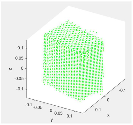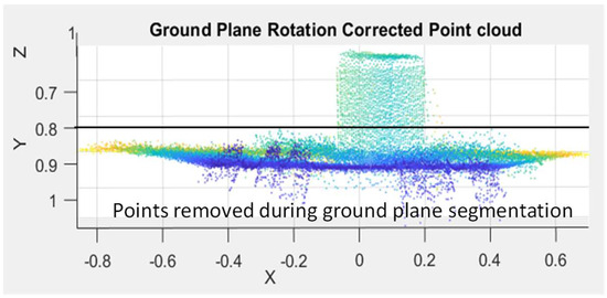 To determine the ground plane orientation, an ArUco marker is placed on the ground plane within the field of view of the ToF sensor. We then capture and process an intensity image of the scene using the OpenCV libraries [39] to detect the presence and orientation of the ArUco marker. The orientation of the ArUco marker provides information about the orientation of the ground plane with respect to the ToF sensor. Once the orientation of the ground plane is determined, the point cloud for the entire scene is then rotated such that the ground plane is aligned with a horizontal x–y plane in our coordinate system. Although only one ArUco marker is required to determine the orientation of the ground plane, we use four markers for redundancy. The ArUco markers are also used to identify and crop the region of interest by positioning the object between the outermost ArUco markers. Figure 5 is an example of a point cloud after ground plane rotation correction. As shown in Figure 5, the ground plane in our point cloud data are substantially parallel with the horizontal x–y plane after ground plane rotation.
