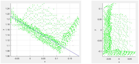 To determine the initial pose of the object, the remaining point cloud of the object is reoriented such that the object is centered about a user-defined origin and axis aligned. In this work, this reorientation is performed by flattening the point cloud into the direction of the ground plane to form a top-view representation of the object. Figure 7 illustrates an example of the result of the flattening process for the point cloud with respect to the ground plane. By flattening the point cloud in this manner, dense clusters of point clouds will appear, which correspond with the edges of the object. Once the point cloud has been flattened, a RANSAC (“RANdom Sample Consensus”) algorithm [24] is used to identify an edge of the object by fitting a line to one of the edges of the point cloud. The RANSAC process first identifies the dense clusters of points that correspond with the edges of the object and then fits a line to one of these clusters of data points. In the example shown in Figure 7, the line that was determined from the RANSAC process is represented as a solid blue line. Once the orientation of an edge of the object is known, the point cloud is rotated such that the object edges are axis-aligned. First, an angle is determined between the line that was determined from the RANSAC process and either the x- or y-axis of the coordinate system. Then, the entire point cloud is rotated about the vertical z-axis with the determined angle to axis align the point cloud with the x–y plane. The axis-aligned point cloud is then shifted such that the center of the point cloud is at the local origin. An example of the result of this process is also shown in Figure 7.