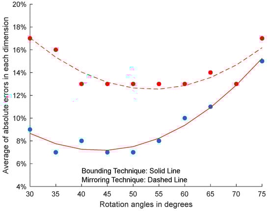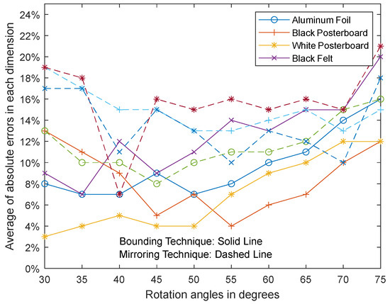 Figure 10 shows the average of absolute errors for each ground plane surface at each rotation angle of the box using the bounding technique and the mirroring technique. Figure 11 shows the average of absolute errors for all of the ground plane surfaces at each rotation angle of the box with respect to the ToF sensor using the bounding technique and the mirroring technique.