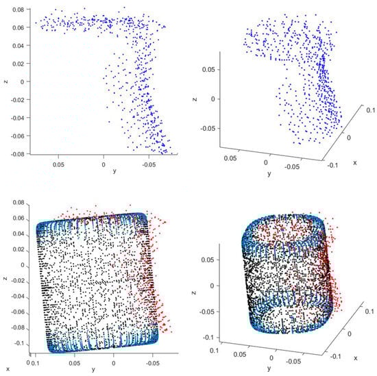 Profile view (top left) and perspective view (top right) of a point cloud for a cylindrical object and profile view of superquadric fit (bottom left) and perspective view of superquadric fit (bottom right) to the point cloud for the cylindrical object in meter units. In the bottom plots, the red data points correspond with the point cloud for the cylindrical object and the black and blue data points corresponds with data points on the surface of the superquadric shape that was determined from the superquadric fitting process.
