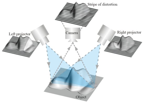 A binocular structured light system is proposed to obtain the measured object’s complete three-dimensional point cloud data. The binocular stereo vision bionic eye binocular parallax principle employs two identical cameras within a particular range at two different angles to simultaneously obtain images of the measured object. By calculating the position deviation in the two images in space, it can obtain the depth information of the measured object. Zhang Guangjun [12] designed a set of binocular structured light systems, which used two cameras and a projector to match the corresponding points of two images, overcoming the shortcoming of the binocular stereoscopic vision method, which had less information about the feature points on the surface of the measured object. Sharma [13] proposed a method for detecting cylindric-less metric information in stereo vision. The information is obtained by considering the isometry of the relative affine structure, which depends on the point depth invariance. The relative affine structure is used to represent the camera transformation of the cylindrical object to realize the measurement. Zhong [14] proposed a dual-projector auto-focus technology for 3D contour measurement. He added an electronic focusing adjustable lens in front of the camera to realize the camera’s auto-focus. He triangulated the pre-calibrated dual projector and a single camera to realize 3D reconstruction. Ying Yu [15] used two projectors to calculate the decoupled projection mode by time-frequency multiplexing, which could reduce the scan shadow and achieve a higher signal-to-noise ratio. ChuFan Jiang [16] developed the system calibration framework for the structural light system of a dual projector and single camera and applied it to three-dimensional measurement. Meanwhile, he proposed the residual correction method based on the system error function and the data fusion method of the angle between the projection direction and the surface normal. The experimental results show that the dual-projector structured light system can effectively expand the measurement range of the single-projector system and further improve the measurement accuracy. Zhang Song [17] introduced a structured light measurement system with two cameras and systematically discussed the system calibration method and the principle of 3D data registration using an iterative nearest point algorithm and 3D data merging of holographic images. Woolford and Burnett [18] described a set of dual-projector systems with a fringe pattern strategy based on spatial reuse. However, this method needs to ensure that the fringe pattern projected by the two projectors is vertical enough, which makes the technology impractical. Petkovic [19] proposed a time-specific phase-shift selection method to effectively separate projection sinusoidal fringe patterns, making them independent of the number and location of the projectors.