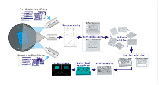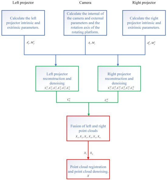 As shown in Figure 6, our approach can be divided into four steps, each represented by a different color. Firstly, the internal and external parameters of the left and right projections are calculated. The internal and external parameters of the camera are calculated, and the rotation axis of the rotating platform is determined. Then the camera is used to capture the modulated Gray code and phase-shift fringe of the object surface, and the point cloud is denoised under the left and right projections. The parallax map of the object under the same measurement angle can be obtained. In the third step, a parallax map is used for phase error correction, and point cloud data fusion is carried out to fill the point cloud holes caused by edge occlusion. In the last step, the point cloud registration and the second denoising of the point cloud are carried out, followed by the three-dimensional reconstruction of the object to be measured.