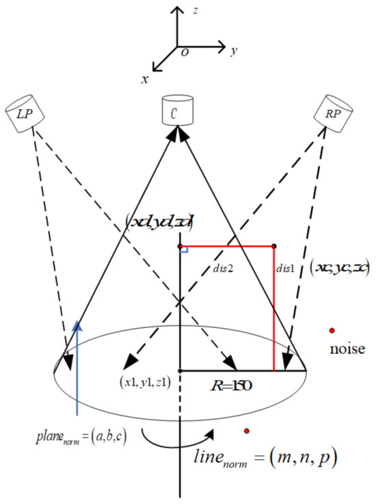 Point cloud noise is generated in the process of point cloud data acquisition, point cloud registration, and stereo-matching reconstruction. Due to the different absorption and reflection characteristics of light, such as the roughness, material properties, and geometric complexity of the measured object’s surface, the reflected signal is poor, and the noise point appears. When the object under test is scanned on the rotating platform, background noise may be generated, resulting in noise points generated by non-measured targets. At the same time, since the measured object is placed on the rotating platform, the camera cannot distinguish the measured object from the rotating platform. As a result, the measured object also reconstructs the rotating platform during the reconstruction, which affects the reconstruction effect and, ultimately, the measurement accuracy. Therefore, removing the noise points outside the rotating platform is necessary. After obtaining the rotating platform’s rotation axis equation and rotation matrix, point cloud reconstruction is carried out through the object pictures taken, and the noise removal is mainly carried out by Formula (10).