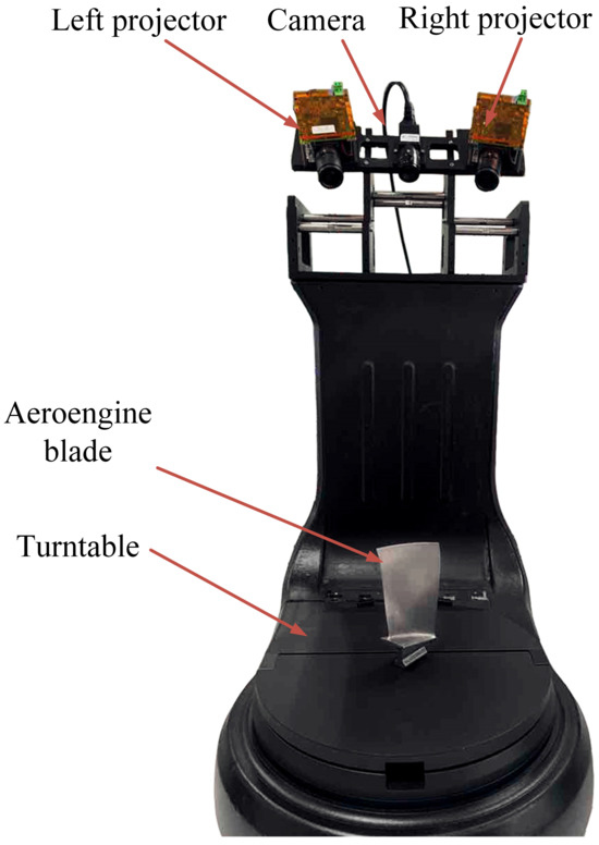 In order to achieve the high-precision 3D reconstruction of the measured object, the relative position between the structured light system and the rotating platform is kept unchanged, and the center of the rotation axis is kept unchanged. The rotating platform is used to obtain point cloud data from different perspectives. In the experiment, the left and right projectors combined with a camera in the middle were used to form a structural light measurement system. The structural light system formed a 27° angle with the rotation axis of the rotating platform. The experimental device is shown in Figure 5. The rotating platform rotates every 60°, and the measured object is sent into the camera’s field of view. The camera records the deformation fringe, calculates the model mapping relationship between the rotating platform’s rotation angle and the point cloud’s rigid transformation, and completes the system calibration. According to the established model mapping relationship, the point cloud of the workpiece from multiple perspectives can be unified into the same coordinate system to complete the rough registration of the point cloud. Finally, the closest point iteration method is used for precise registration. The structure light measurement system uses a DLP4500SL projector with a resolution is 1140 × 912; Vision manufactures industrial camera HS510GC with resolution of 2464 × 2056.